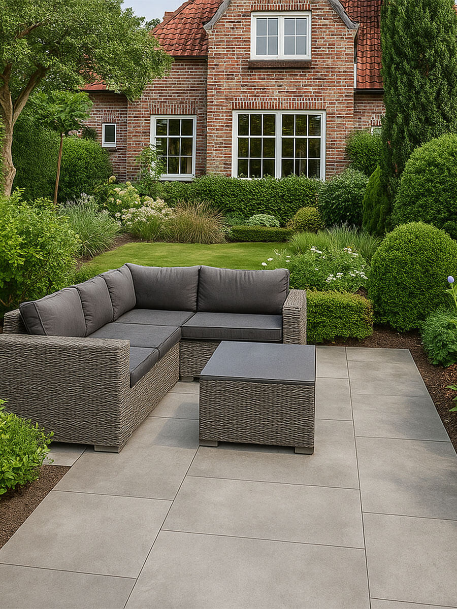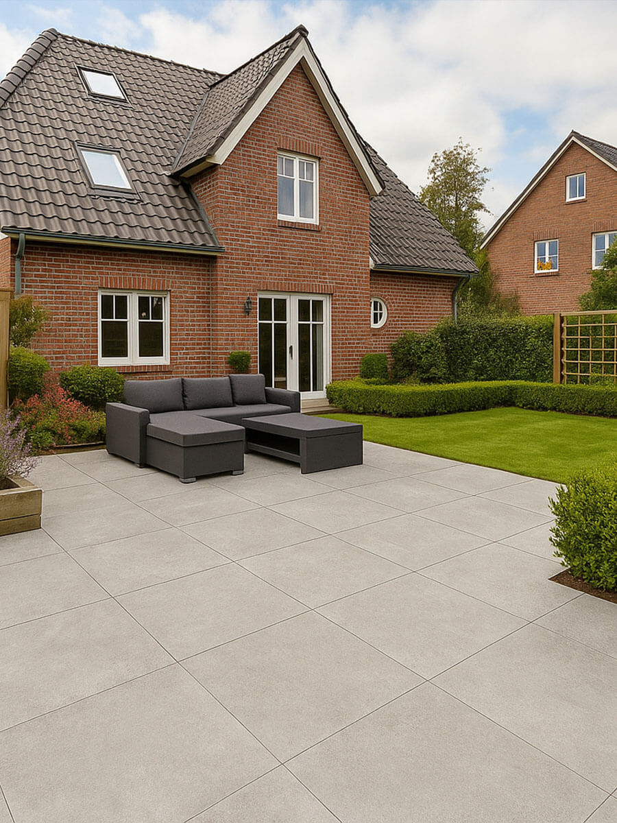 Die Keramikfliesen haben eine gleichmäßige graue Farbe und lassen sich daher in jedem Gartenstil einsetzen – ob für einen modernen, klaren Beton-Look oder in einer natürlichen Umgebung.