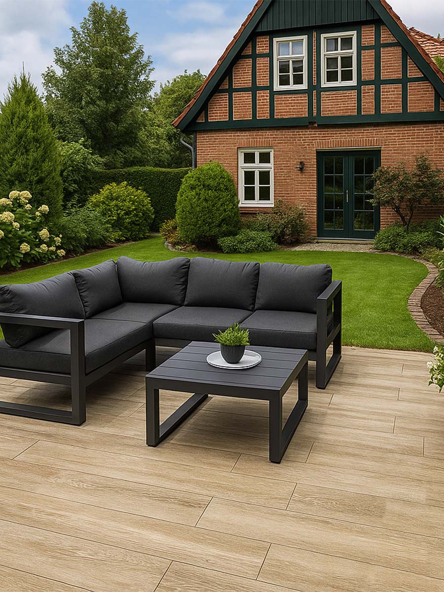 Eine Holzoptik-Platte verleiht deinem Garten einen einzigartigen Charakter und lässt sich wunderbar mit Holzelementen und viel Grün kombinieren.