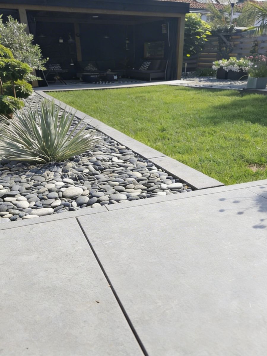 Les dalles grises se combinent également très bien avec un gravier décoratif plus clair, comme par exemple le Crystal White gravier marbre concassé.